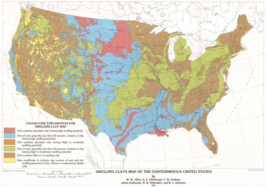 Expansive clay is common in states like Missouri, Oklahoma, and Kansas, derived from clay-rich shales and ancient sea deposits. The “Pierre Shale” formation underlying the Dakotas and eastern Colorado, for example, produces very high swell potentials. One of the worst damage regions in the nation is along Colorado’s Front Range urban corridor (Denver–Colorado Springs), underlain by Cretaceous clay-shales; here expansive clays have caused widespread foundation damage . (This will be discussed in detail below.)